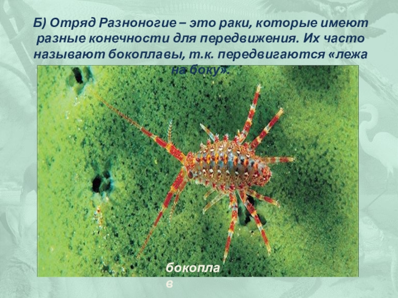 А) Отряд Равноногие внешне их ноги кажутся одинаковыми. В пресных водоемах встречается водяной ослик, который ползает по дну на тонких ногах. На голове ослика расположено 8 простых глазков.