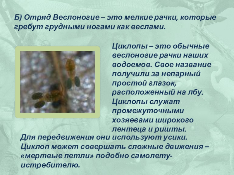 Циклопы – это обычные веслоногие рачки наших водоемов. Свое название получили за непарный простой глазок, расположенный на лбу. Циклопы служат промежуточными хозяевами широкого лентеца и ришты.