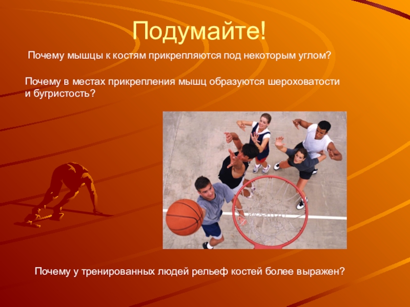 Подумайте!Почему мышцы к костям прикрепляются под некоторым углом?Почему в местах прикрепления мышц образуются шероховатости и бугристость? Почему