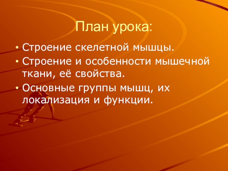 План урока:Строение скелетной мышцы.Строение и особенности мышечной ткани, её свойства.Основные группы мышц, их локализация и функции.