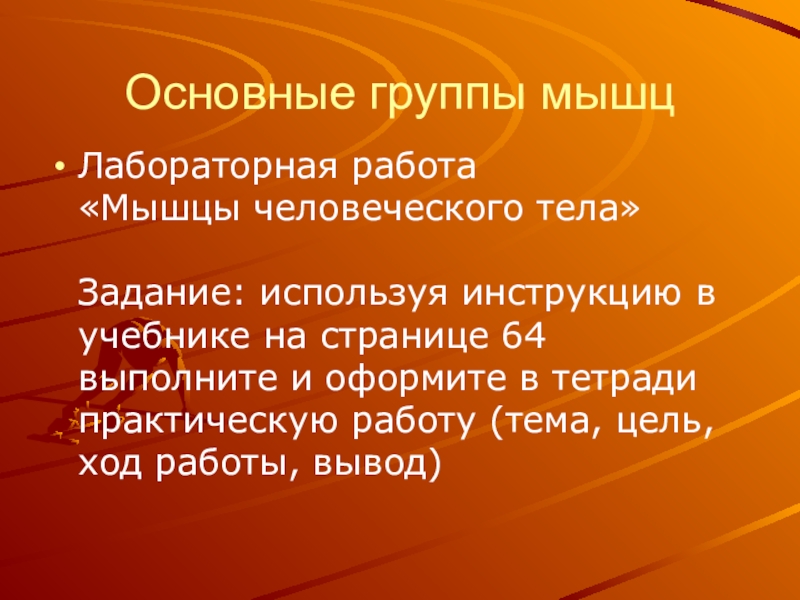 Основные группы мышцЛабораторная работа «Мышцы человеческого тела»  Задание: используя инструкцию в учебнике на странице 64 выполните