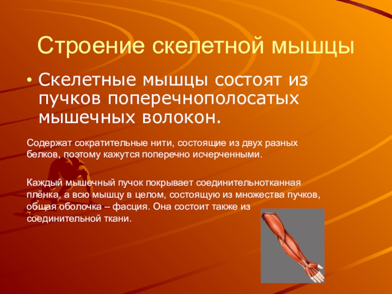 Строение скелетной мышцыСкелетные мышцы состоят из пучков поперечнополосатых мышечных волокон.Содержат сократительные нити, состоящие из двух разных белков,