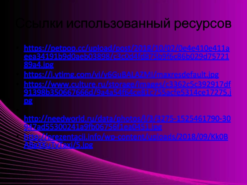 Ссылки использованный ресурсовhttps://petpop.cc/upload/post/2018/10/02/0e4e410e411aeea34191b9d0aeb03898/c3c0d4fd875b9f6c86b029d7572189a4.jpg https://i.ytimg.com/vi/y6GuBALAZMI/maxresdefault.jpg https://www.culture.ru/storage/images/c3362c5c392917df91398b350667666d/9a4a54f64ce81c755acfe5314ce17275.jpg http://needworld.ru/data/photos/l/3/3275-1525461790-30947ad55300241a9fb06756f1ea0451.jpg http://prezentacii.info/wp-content/uploads/2018/09/Kk0BABgXKuTvTaxj/5.jpg