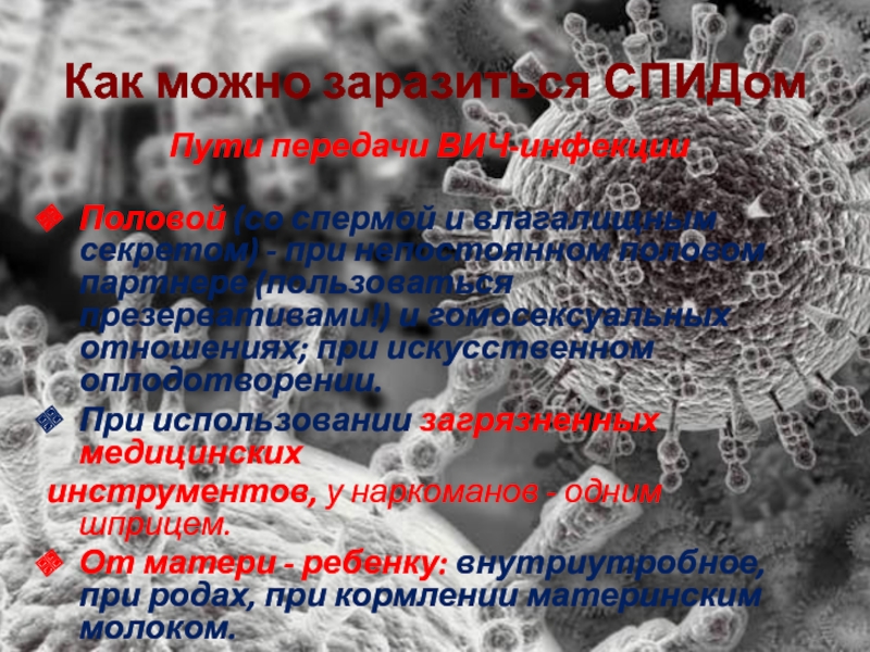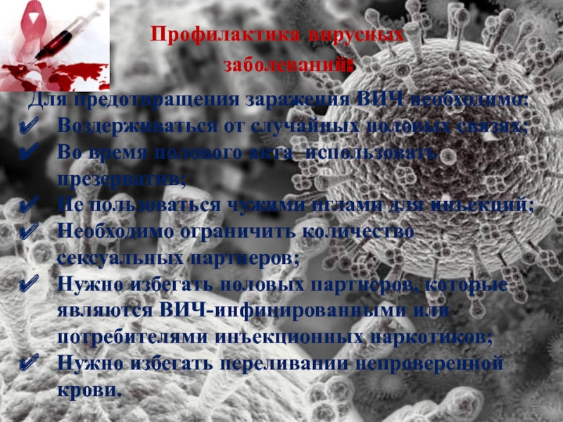 Нужно избегать половых партнеров, которые являются ВИЧ-инфицированными или потребителями инъекционных наркотиков;