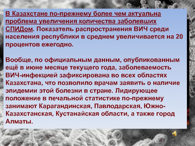 В Казахстане по-прежнему более чем актуальна проблема увеличения количества заболевших СПИДом. Показатель распространения ВИЧ среди населения республики в среднем увеличивается на 20 процентов ежегодно.