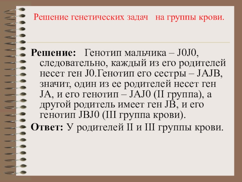 J0J0, следовательно, каждый из его родителей несет ген J0.Генотип его сестры – JAJB, значит, один из ее родителей несет ген JA, и его генотип – JAJ0 (II группа), а другой родитель имеет ген JB, и его генотип JBJ0 (III группа крови).