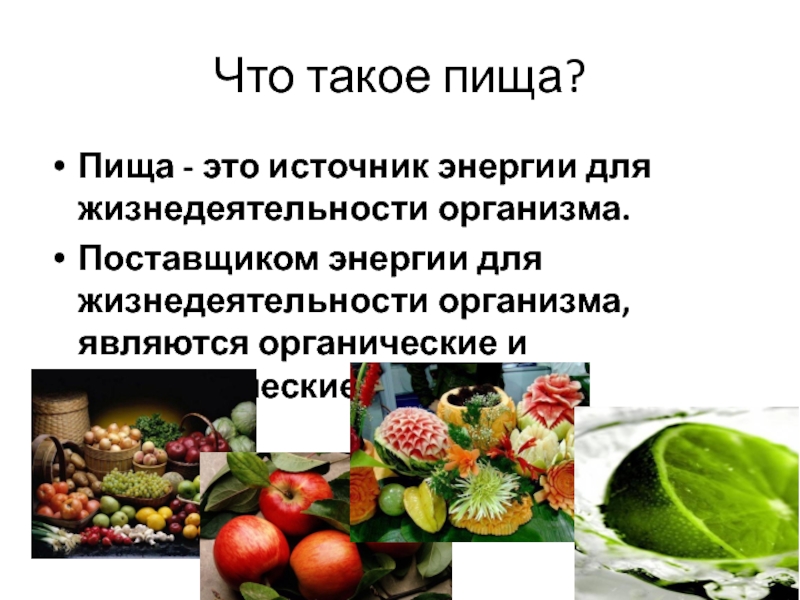 Что такое пища?Пища - это источник энергии для жизнедеятельности организма.Поставщиком энергии для жизнедеятельности организма, являются органические и