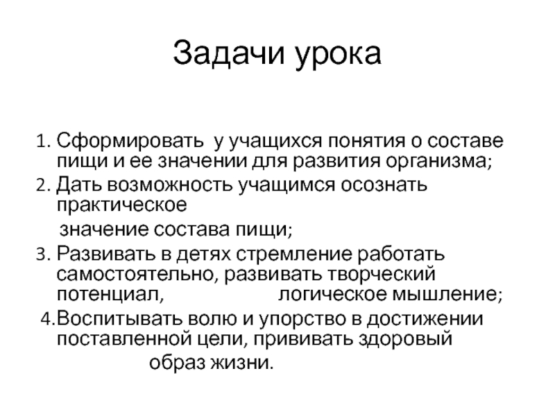 Задачи урока 1. Сформировать у учащихся понятия о составе пищи и ее значении для развития организма;2. Дать возможность учащимся осознать практическое значение состава пищи;3. Развивать в детях стремление работать самостоятельно, развивать творческий потенциал,