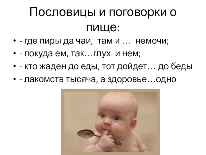 Пословицы и поговорки о пище:- где пиры да чаи, там и … немочи;- покуда ем, так…глух и