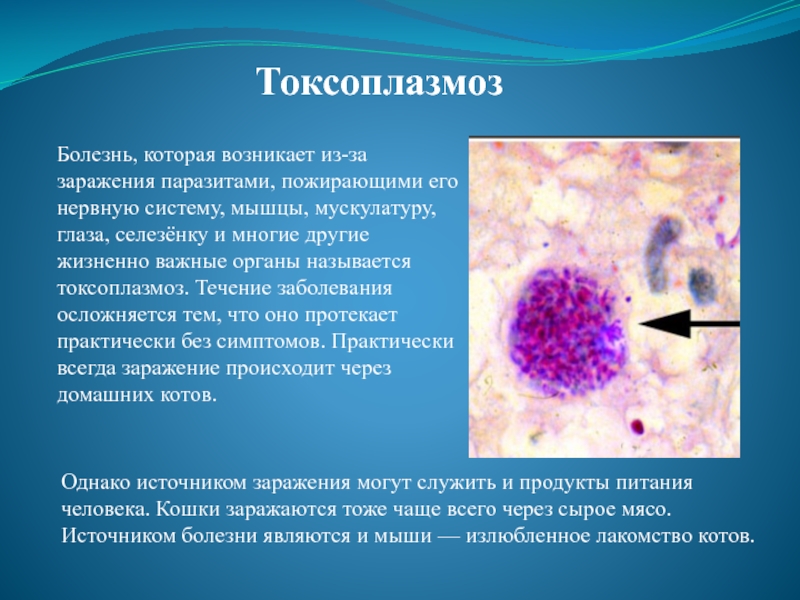 Однако источником заражения могут служить и продукты питания человека. Кошки заражаются тоже чаще всего через сырое мясо. Источником болезни являются и мыши — излюбленное лакомство котов.