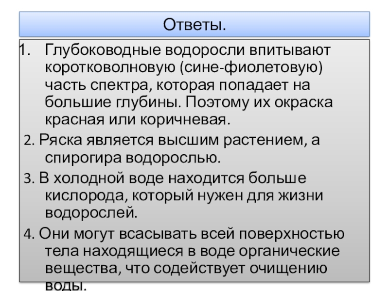 1.Большинство водорослей зелёного цвета, но глубоководные – красные. Почему?
