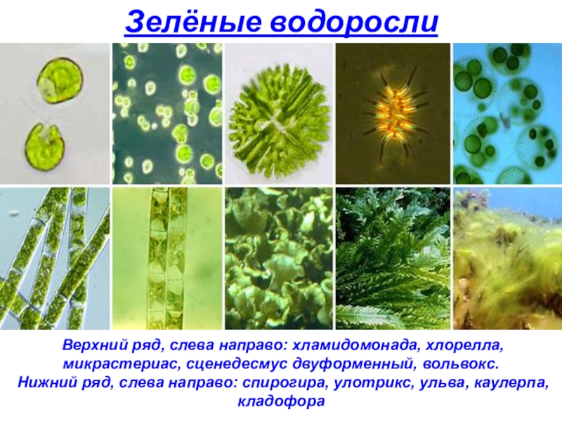 Нижний ряд, слева направо: спирогира, улотрикс, ульва, каулерпа, кладофора