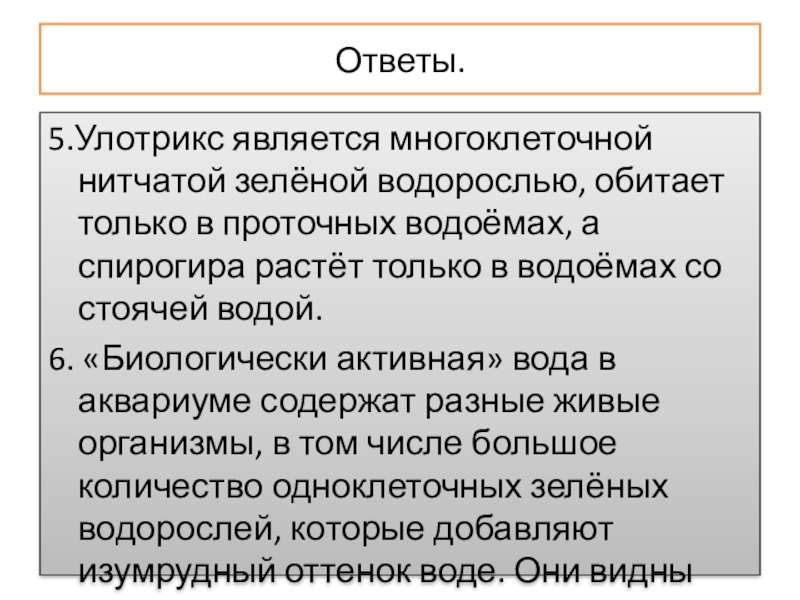 5.Улотрикс является многоклеточной нитчатой зелёной водорослью, обитает только в проточных водоёмах,