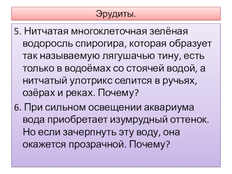 тину, есть только в водоёмах со стоячей водой, а нитчатый улотрикс селится в ручьях, озёрах и реках. Почему?