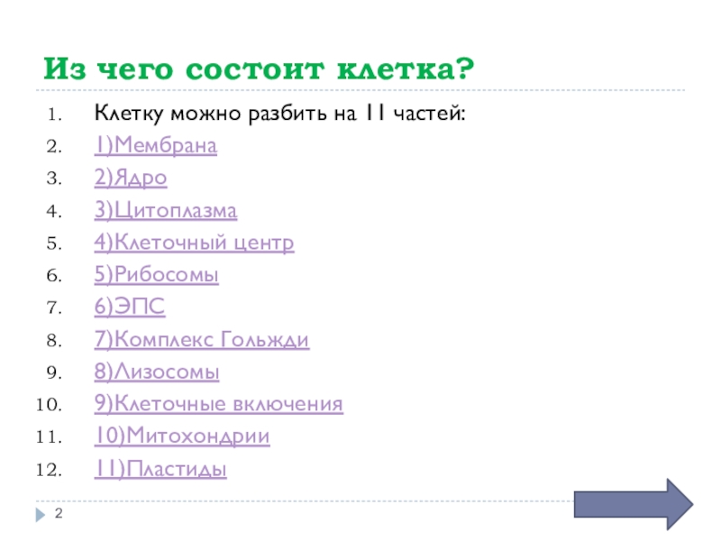 3 группы: постоянные, или органоиды, осуществляющие общие функции клетки (например, Митохондрии, Гольджи комплекс, Хлоропласты); временные, или параплазматические, образования, появляющиеся и исчезающие в процессе обмена веществ (например, секреторные гранулы, питательные вещества, жир, крахмал и др.); специальные, или метаплазматические, образования, имеющиеся в некоторых специализированных клетках, где они выполняют частные функции, например сокращения (миофибриллы мышечных клеток), опоры (тонофибриллы в клетках эпидермиса).