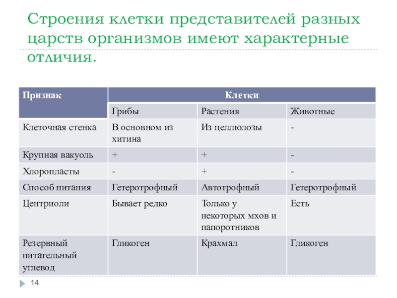 Слайд 14Строения клетки представителей разных царств организмов имеют характерные отличия.