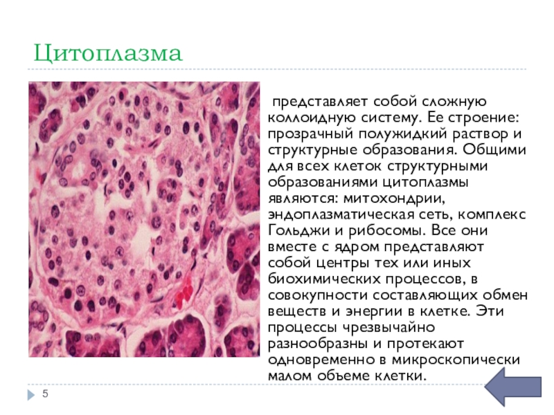 структурные образования. Общими для всех клеток структурными образованиями цитоплазмы являются: митохондрии, эндоплазматическая сеть, комплекс Гольджи и рибосомы. Все они вместе с ядром представляют собой центры тех или иных биохимических процессов, в совокупности составляющих обмен веществ и энергии в клетке. Эти процессы чрезвычайно разнообразны и протекают одновременно в микроскопически малом объеме клетки.