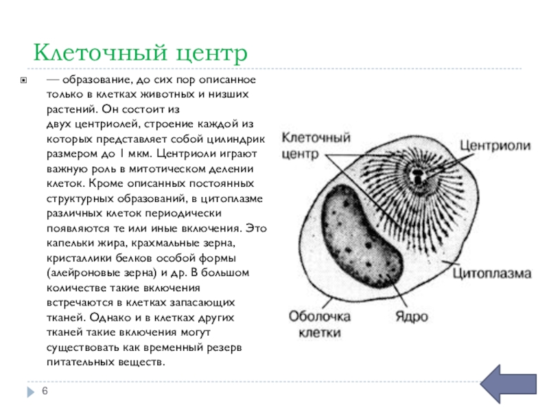 и низших растений. Он состоит из двух центриолей, строение каждой из которых представляет собой цилиндрик размером до 1 мкм. Центриоли играют важную роль в митотическом делении клеток. Кроме описанных постоянных структурных образований, в цитоплазме различных клеток периодически появляются те или иные включения. Это капельки жира, крахмальные зерна, кристаллики белков особой формы (алейроновые зерна) и др. В большом количестве такие включения встречаются в клетках запасающих тканей. Однако и в клетках других тканей такие включения могут существовать как временный резерв питательных веществ.