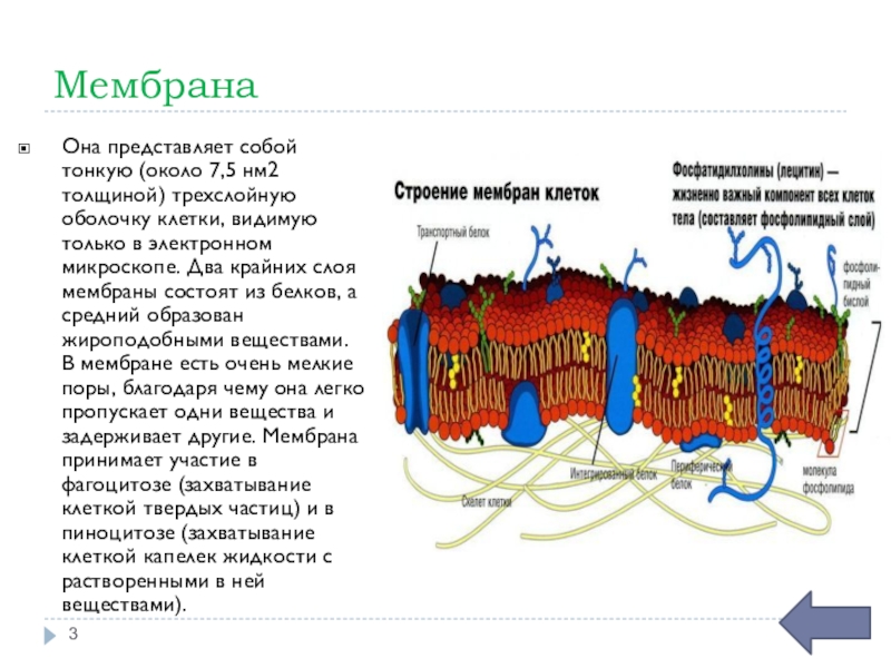 клетки, видимую только в электронном микроскопе. Два крайних слоя мембраны состоят из белков, а средний образован жироподобными веществами. В мембране есть очень мелкие поры, благодаря чему она легко пропускает одни вещества и задерживает другие. Мембрана принимает участие в фагоцитозе (захватывание клеткой твердых частиц) и в пиноцитозе (захватывание клеткой капелек жидкости с растворенными в ней веществами).