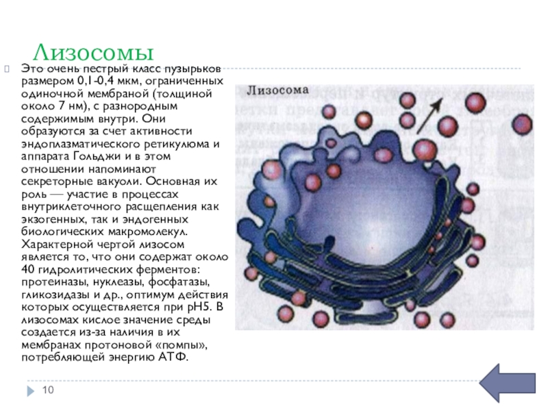 (толщиной около 7 нм), с разнородным содержимым внутри. Они образуются за счет активности эндоплазматического ретикулюма и аппарата Гольджи и в этом отношении напоминают секреторные вакуоли. Основная их роль — участие в процессах внутриклеточного расщепления как экзогенных, так и эндогенных биологических макромолекул. Характерной чертой лизосом является то, что они содержат около 40 гидролитических ферментов: протеиназы, нуклеазы, фосфатазы, гликозидазы и др., оптимум действия которых осуществляется при рН5. В лизосомах кислое значение среды создается из-за наличия в их мембранах протоновой «помпы», потребляющей энергию АТФ.