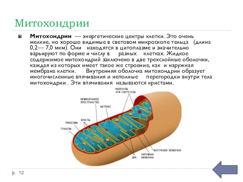 в световом микроскопе тельца (длина 0,2— 7,0 мкм). Они находятся в цитоплазме и значительно варьируют по форме и числу в разных клетках. Жидкое содержимое митохондрий заключено в две трехслойные оболочки, каждая из которых имеет такое же строение, как и наружная мембрана клетки. Внутренняя оболочка митохондрии образует многочисленные впячивания и неполные перегородки внутри тела митохондрии . Эти впячивания называются кристами.