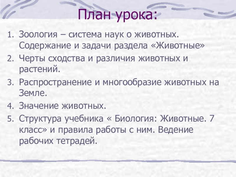 План урока:Зоология – система наук о животных. Содержание и задачи раздела «Животные»Черты сходства и различия животных и
