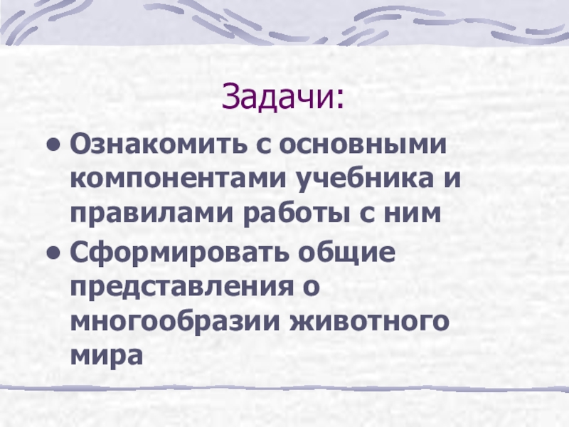 Задачи:Ознакомить с основными компонентами учебника и правилами работы с нимСформировать общие представления о многообразии животного мира