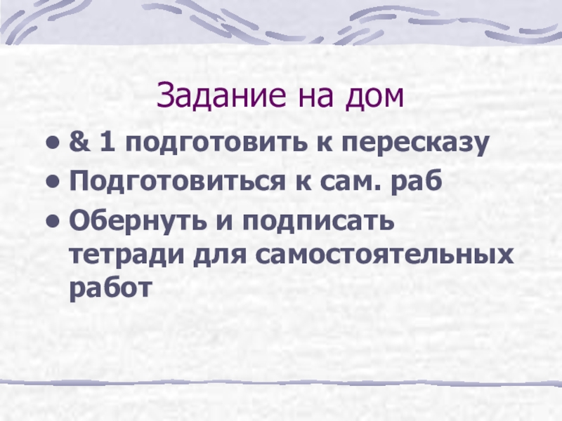 Задание на дом& 1 подготовить к пересказуПодготовиться к сам. рабОбернуть и подписать тетради для самостоятельных работ