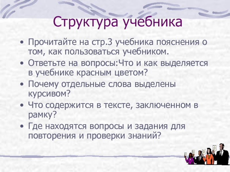 Структура учебникаПрочитайте на стр.3 учебника пояснения о том, как пользоваться учебником.Ответьте на вопросы:Что и как выделяется в