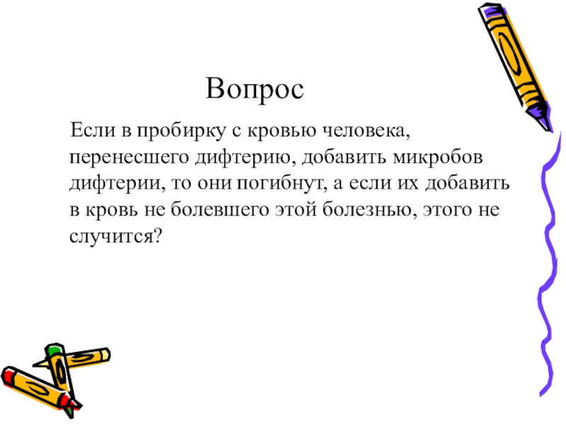 микробов дифтерии, то они погибнут, а если их добавить в кровь не болевшего этой болезнью, этого не случится?