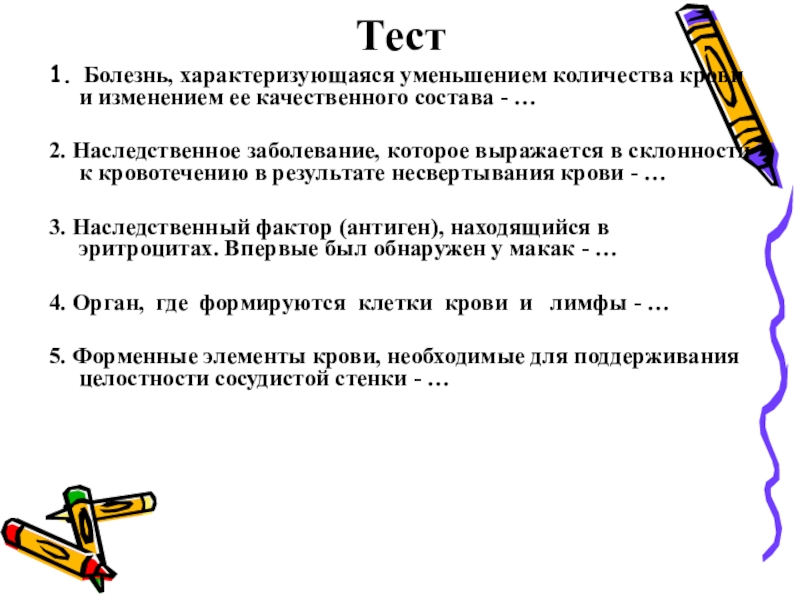 1. Болезнь, характеризующаяся уменьшением количества крови и изменением ее качественного состава