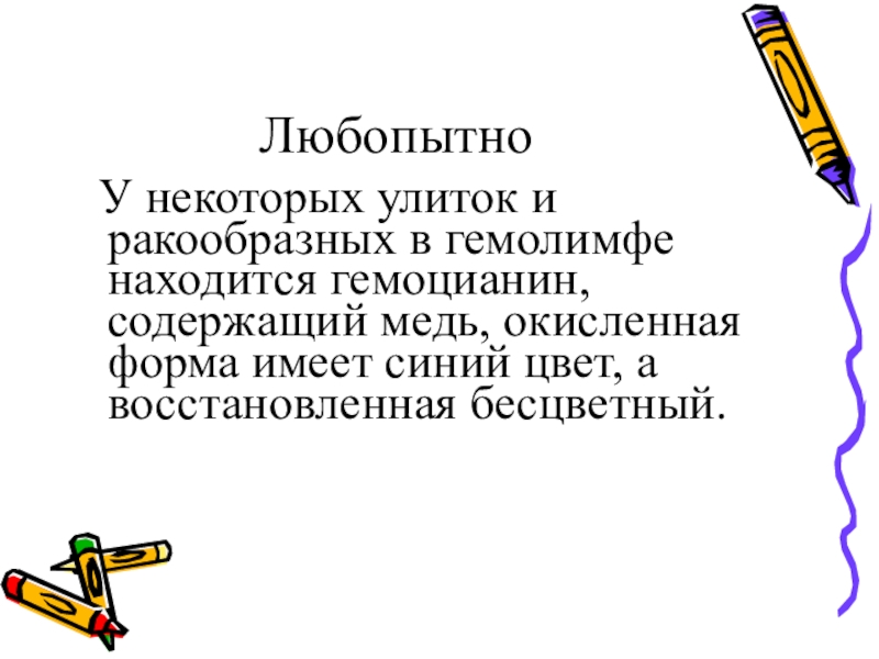 У некоторых улиток и ракообразных в гемолимфе находится гемоцианин, содержащий