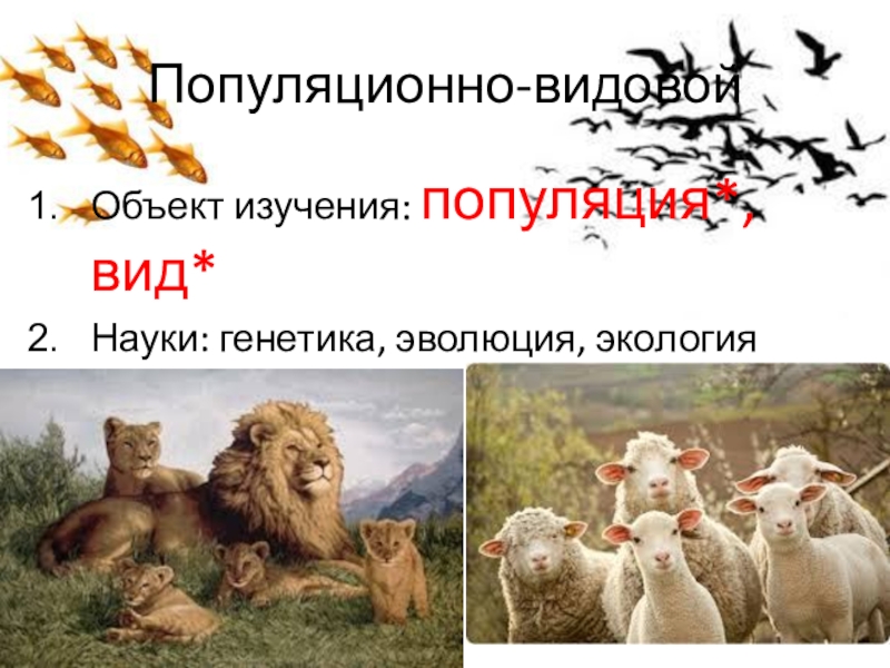 Популяционно-видовойОбъект изучения: популяция*, вид*Науки: генетика, эволюция, экологияПримеры: