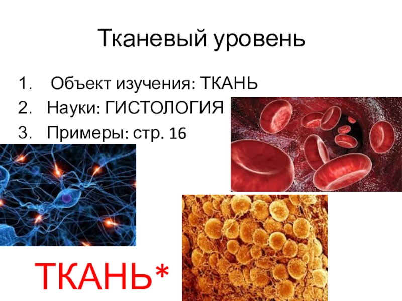 Тканевый уровень Объект изучения: ТКАНЬНауки: ГИСТОЛОГИЯПримеры: стр. 16 ТКАНЬ*