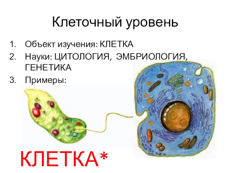 Клеточный уровеньОбъект изучения: КЛЕТКА Науки: ЦИТОЛОГИЯ, ЭМБРИОЛОГИЯ, ГЕНЕТИКАПримеры: КЛЕТКА*
