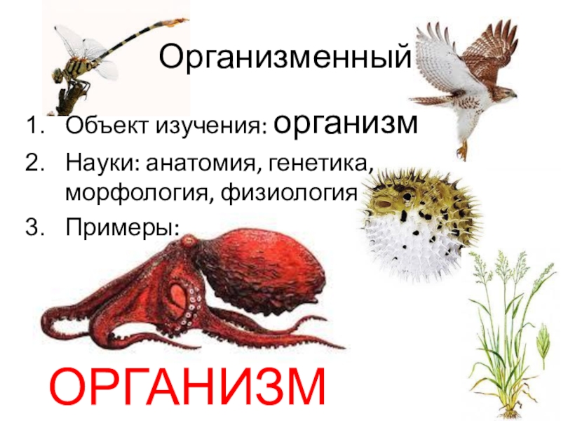 Организменный Объект изучения: организмНауки: анатомия, генетика, морфология, физиологияПримеры: ОРГАНИЗМ*