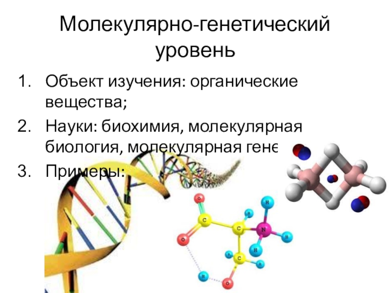 Молекулярно-генетический уровеньОбъект изучения: органические вещества;Науки: биохимия, молекулярная биология, молекулярная генетикаПримеры: