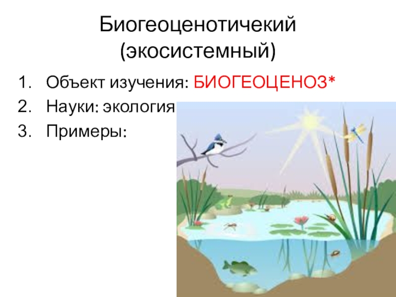 Биогеоценотичекий  (экосистемный)Объект изучения: БИОГЕОЦЕНОЗ*Науки: экологияПримеры: