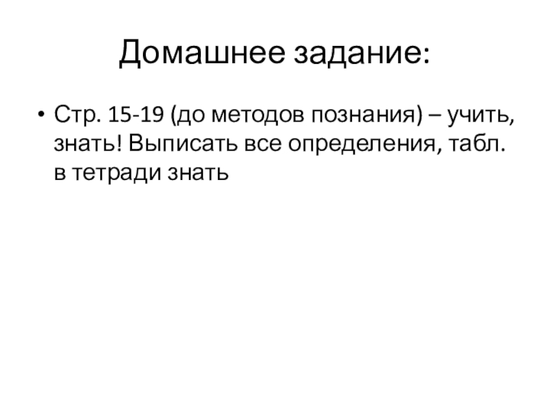 Домашнее задание:Стр. 15-19 (до методов познания) – учить, знать! Выписать все определения, табл. в тетради знать