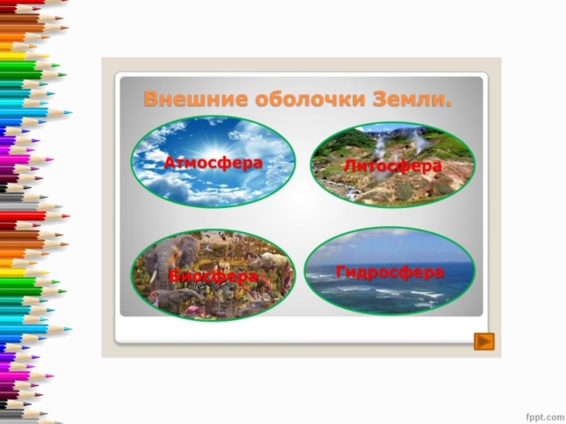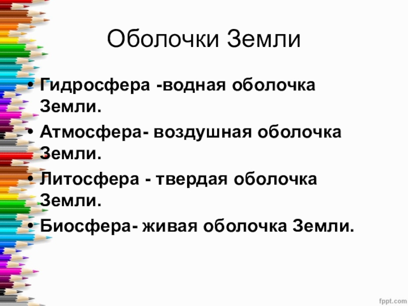 Оболочки ЗемлиГидросфера -водная оболочка Земли.Атмосфера- воздушная оболочка Земли.Литосфера - твердая оболочка Земли.Биосфера- живая оболочка Земли.