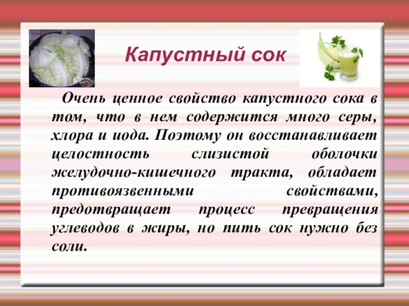 в нем содержится много серы, хлора и иода. Поэтому он восстанавливает целостность слизистой оболочки желудочно-кишечного тракта, обладает противоязвенными свойствами, предотвращает процесс превращения углеводов в жиры, но пить сок нужно без соли.