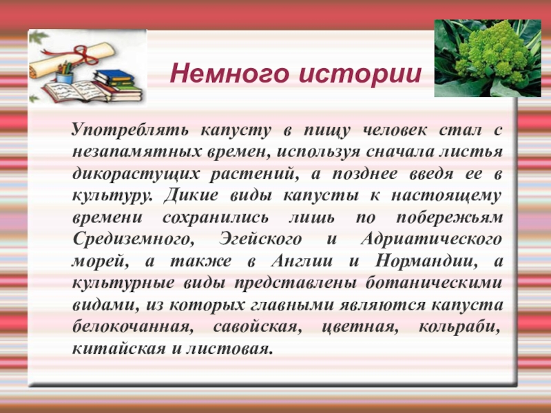 с незапамятных времен, используя сначала листья дикорастущих растений, а позднее введя ее в культуру. Дикие виды капусты к настоящему времени сохранились лишь по побережьям Средиземного, Эгейского и Адриатического морей, а также в Англии и Нормандии, а культурные виды представлены ботаническими видами, из которых главными являются капуста белокочанная, савойская, цветная, кольраби, китайская и листовая.