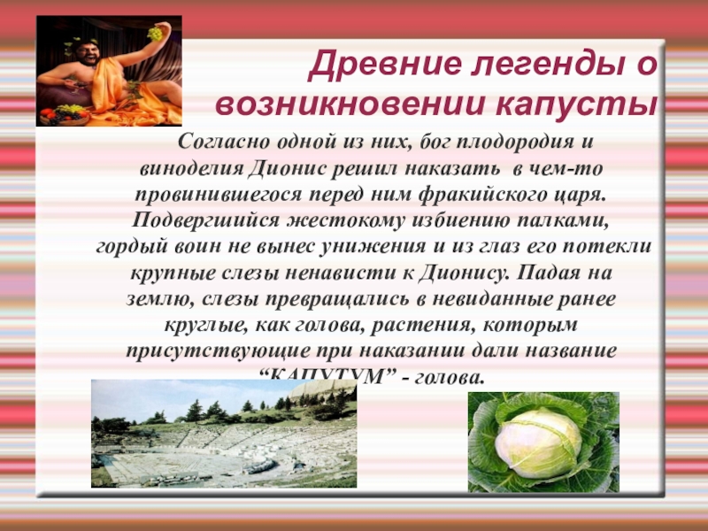 из них, бог плодородия и виноделия Дионис решил наказать в чем-то провинившегося перед ним фракийского царя. Подвергшийся жестокому избиению палками, гордый воин не вынес унижения и из глаз его потекли крупные слезы ненависти к Дионису. Падая на землю, слезы превращались в невиданные ранее круглые, как голова, растения, которым присутствующие при наказании дали название “КАПУТУМ” - голова.