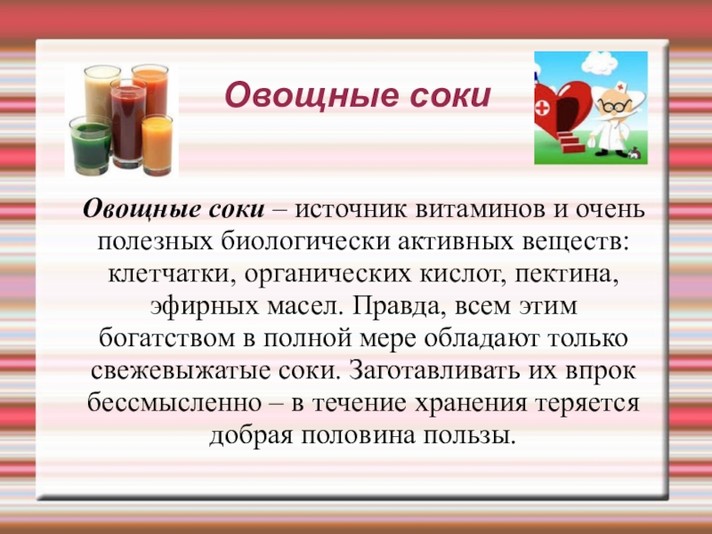 полезных биологически активных веществ: клетчатки, органических кислот, пектина, эфирных масел. Правда, всем этим богатством в полной мере обладают только свежевыжатые соки. Заготавливать их впрок бессмысленно – в течение хранения теряется добрая половина пользы.