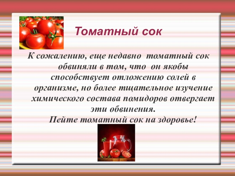 К сожалению, еще недавно томатный сок обвиняли в том, что