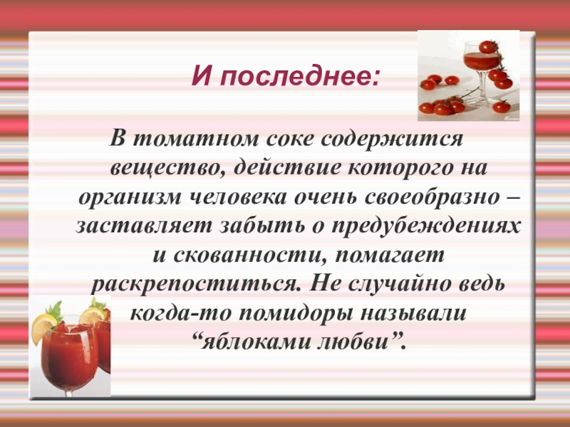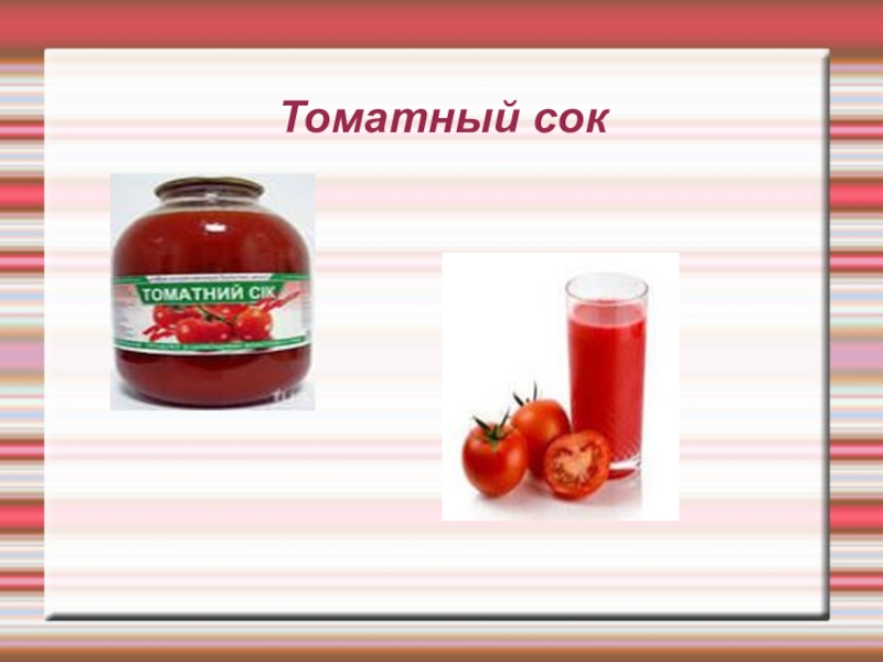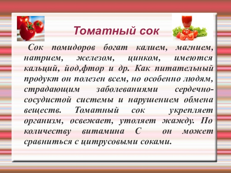 кальций, йод,фтор и др. Как питательный продукт он полезен всем, но особенно людям, страдающим заболеваниями сердечно-сосудистой системы и нарушением обмена веществ. Томатный сок укрепляет организм, освежает, утоляет жажду. По количеству витамина С он может сравниться с цитрусовыми соками.