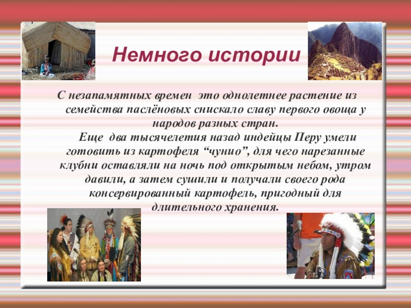 Еще два тысячелетия назад индейцы Перу умели готовить из картофеля “чунио”, для чего нарезанные клубни оставляли на ночь под открытым небом, утром давили, а затем сушили и получали своего рода консервированный картофель, пригодный для длительного хранения.