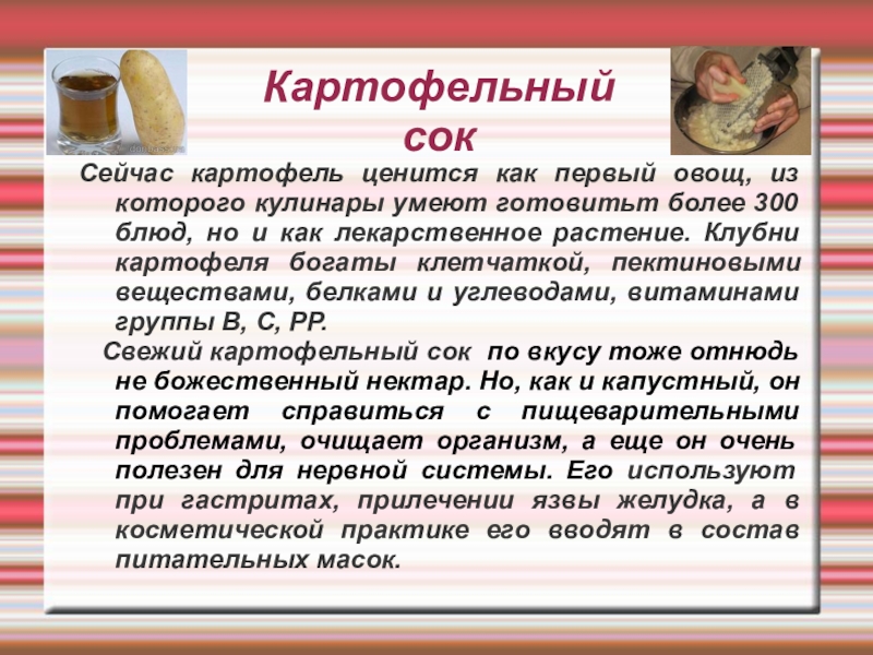 Свежий картофельный сок по вкусу тоже отнюдь не божественный нектар. Но, как и капустный, он помогает справиться с пищеварительными проблемами, очищает организм, а еще он очень полезен для нервной системы. Его используют при гастритах, прилечении язвы желудка, а в косметической практике его вводят в состав питательных масок.