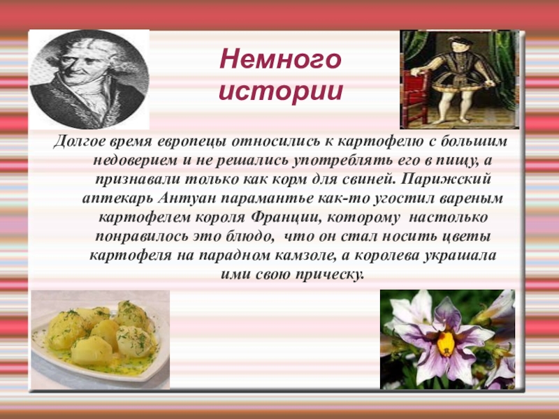 не решались употреблять его в пищу, а признавали только как корм для свиней. Парижский аптекарь Антуан парамантье как-то угостил вареным картофелем короля Франции, которому настолько понравилось это блюдо, что он стал носить цветы картофеля на парадном камзоле, а королева украшала ими свою прическу.