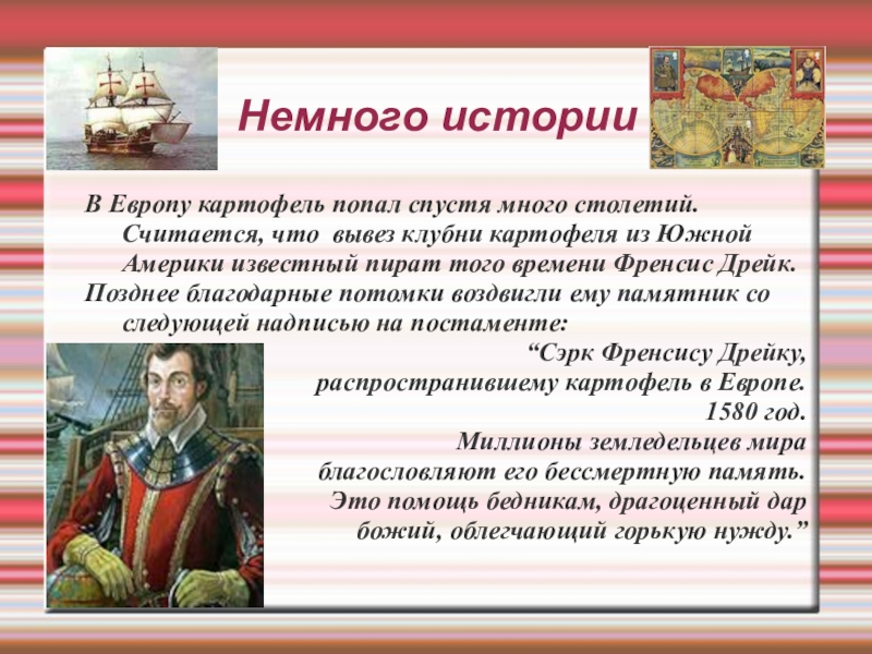 клубни картофеля из Южной Америки известный пират того времени Френсис Дрейк.